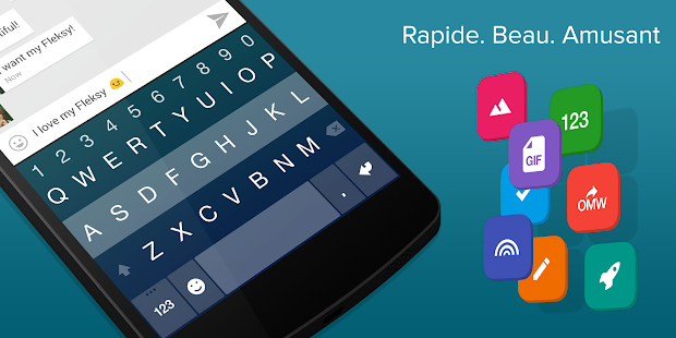 Fleksy is the way amusing, customizable hit, and it is officially the fastest keyboard in the world .Fleksy is the only keyboard allowing you to find and send GIFs and customize your keyboard withpowerful Extensions and colorful themes .